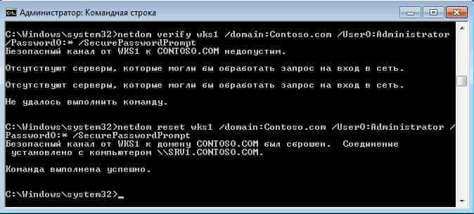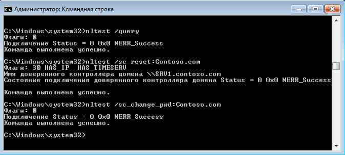 Nltest /sc_reset:Contoso.com — сбросить учетную запись компьютера в домене;