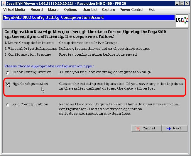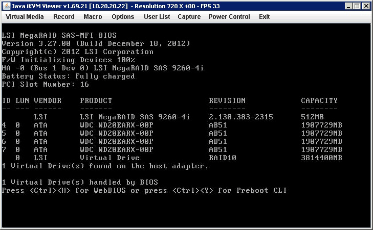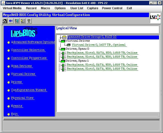 Процедура создания RAID10 на контроллерах LSI MegaRAID несколько непрозрачна. Рассмотрим ее по шагам на примере модели SAS 9260-4i и четырех SATA HDD.