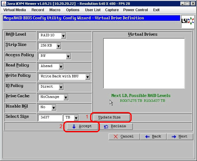 Для задания максимально допустимого объема нового виртуального диска, используйте кнопку Update Size, а затем нажмите Accept.