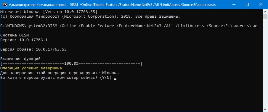 Примечание: параметр / LimitAccess указывает DISM не проверять Центр обновления Windows или Службы обновления Windows Server на наличие исходных файлов. - Нажать «Enter». Начнется установка .NET Framework 3.5