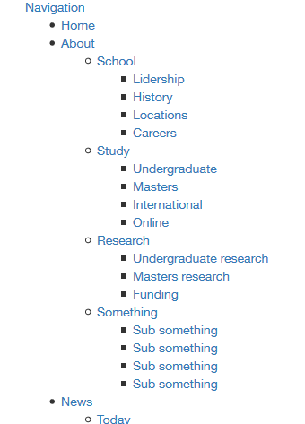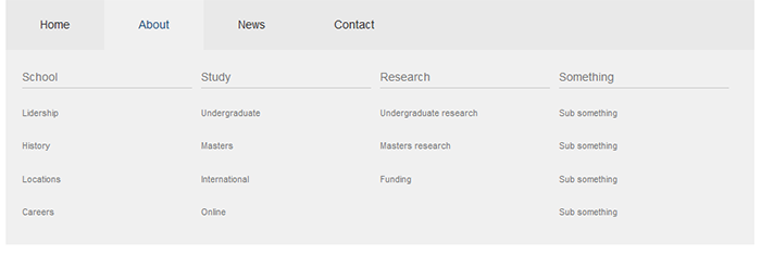Теперь нам потребуется верстка для организации мега меню. Это стандартная типовая верстка меню списками, примерно такая: